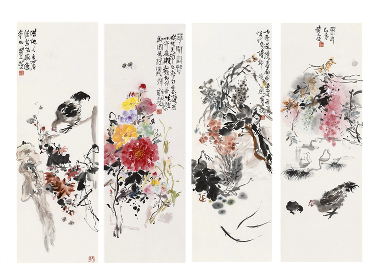 黄三枝:书画不仅同源而且同法!书画表面看不尽相同,实则一样,其肯定的用笔,线条的刚柔虚实,基本规律都是一样的,历代大画家都是大书法家,画家如能在书法上精妙也有助于提高并发挥绘画的表现力!书画从古至今是两条河两条线。如鸟之两翼,车之两轮,缺一不可。潘天寿讲:強其骨,其要求就是线条的笔力遒劲,只有骨法用笔,才能气韵生动,这是互为作用!元人赵孟頫有一首非常著名的诗,讲的非常透彻:“石如飞白木如籀,写竹还应八法通,若也有人能会此,须知书画本来同”石如飞白讲的是书法的行草,木如籀一定是篆书,写竹用笔应该更加丰富了,所以中国画是以书入画,靠的是笔力,米芾讲:八面出锋。简单理解笔尖,笔肚,笔根都要用上。看有的人作画只用笔尖,整个画面雷同,变化少。傅抱石先生强调,用笔一定要笔尖,笔肚,笔根都要用上。傅抱石作画它是八面出锋、全面开花,神出鬼没,可谓淋漓尽致。很多笔法是靠长期实践积累形成的,现在很多人在书法上没下多少功夫,题在画上很不协调,破坏了画面,很是可惜。