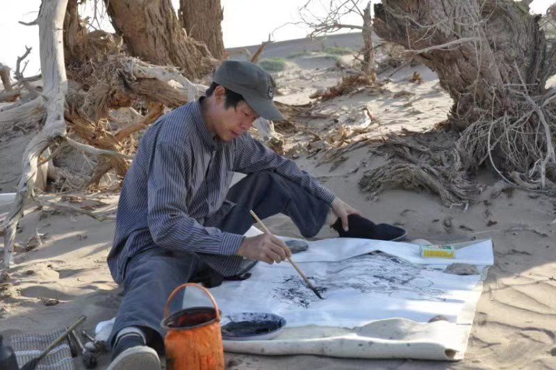 黄三枝:人生的磨砺都是修行,磨难与变迁,人间冷暖都是人生的福报!零七年至零九年,我对胡杨的敬畏和感悟,心向往之,胡杨有生而不死,死而不倒,倒而不朽三千年的精神令我感动,我与同伴(王权朝,刘军胜)一并前往。从酒泉下额济纳旗有400多公里。怪树林离县城20多公里,为了写生我们在县城买了矿泉水和方便面带到怪树林,此地有三间小铁皮房。一个看门老人。六月份的天气温差较大,白天二十多度,晚上接近零度,早晨用矿泉水泡上方便面中午吃,普通人已经习惯了普通的生活。画胡杨先做加法后做减法,很多人画树都比较平,没有结构。画胡杨尤其需要线条和结构,缺一不可,否则没有深度和厚度!现在时常想起胡杨精神,也时时激励自己努力精进!不敢懈怠,艺术绘画不进则退。