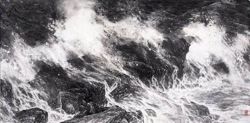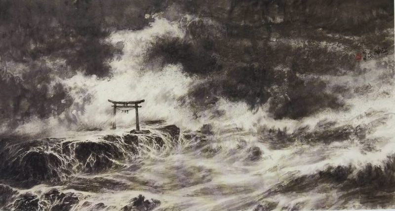 我出生于广西,生活在大山之中,我從大山中走出,來到海水围绕的岛国日本,看到大海十分激动。尤其是在苦熬孤独寂寞的日子里,我沿着海岸行走,面对大海,观大海浩翰飘渺,时而平靜,时而波涛涌起,引起我无限感叹!人生不就如此吗?我似乎找到解脫苦恼的地方,有段时间我常漫步海滩,登临礁石,看海天一色,听海鸥飞鸣,頓时心旷神怡,胸怀坦荡,引发无限联想,我要擺脫目前局限于传统的画题和画法,尝试创作大海作品,我为广岛宿王寺绘制障壁画后,寺方招待我遊四国八十八寺,路经海岸,看到海潮卷起浪涛形如巨龙,非常震撼,感受到自然的无穷力量,人的生命在大自然中如此渺小微弱,心灵受到很大的冲击,激励自己全身心投入创作,完成了作品〈海潮如龙〉等大海系列作品,获得过近美展最高奖一近美展大赏,在桂林美術馆、深圳美术馆展出,得到美术同行和广大观众的好评。我深深的体会到,只有投身到大自然 ,用生命体验大自然,在生活中感受最深的衍化出來的是自己生命的光芒,才会充滿生命激情,将生命激情融入艺术创作,这样创作出的作品是有生命力的,自己感动,也感动了別人。在表現大海的技法方面作了些新的尝试,当然,中国画的构成方式、参差关系,因勢利导、筆筆相因的运筆模式等等都溶入自身的血液中了,自然在画面中会显露出來,只是強化了传统的留白法,不用白色顏料,利用纸的空白,表現不同的程度的色调,水墨相潼,渾染出強弱虚实的效果。在画大海的过程中,运筆用墨是自由的,许多新技法在创作中偶然得到,可以好好总结,对画其他題材的作品亦是参考利用。