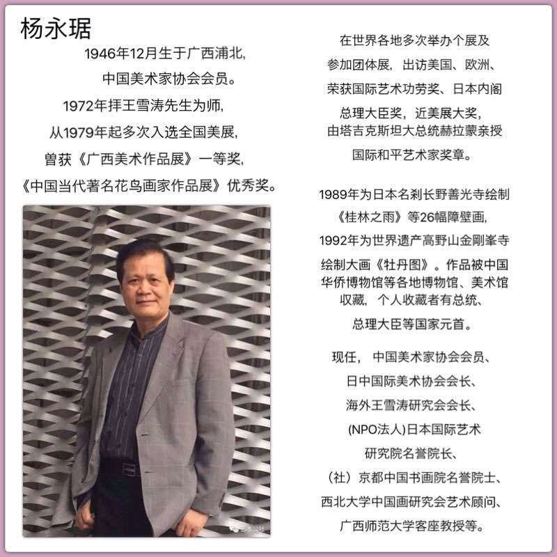 楊永琚老師是在廣西畫家中,遠在70年代較早走向全國取材寫生,拜師求藝的畫家。他出色的人物、山水、花鳥等作品。都是在精研傳統和師造化的基礎之上,取衆家之長,以形寫神,使作品具有永恆感人的藝術魅力。他是我們旅日畫家中的佼佼者。旅日30多年來,在國內和國際畫壇上都取得了引人注目的成就,并對中日文化交流做出了不凡的貢獻。我們爲永居老師高興!並祝他在今後的藝術道路上取得更大的成就!創作出更多更精彩的作品來!