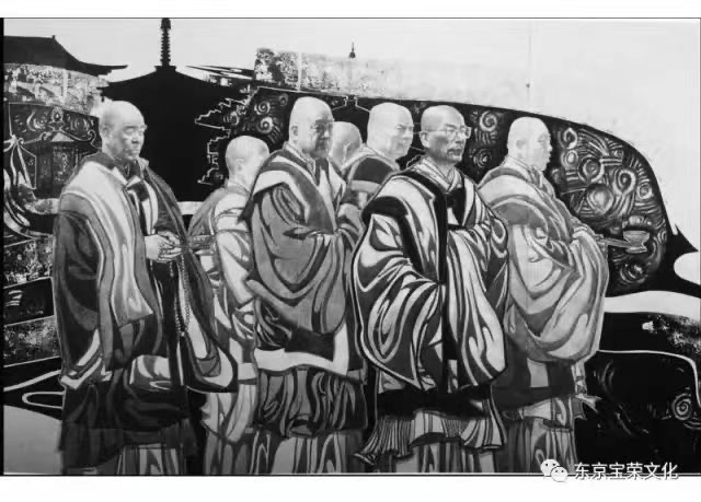 王子江:在创作这个作品的过程中,我经历了近七年的时间。药师寺所有的活动。基本上我都去参加,最长的一次是在药师寺里面住了将近一个月的时间,包括给佛像的扫除,晚上的冥想,坐禅,学经等各个方面。这个寺庙以外的活动去,我都跟他们去做过,长途跋涉啊。这幅作品里边的僧人,每个人的特点,每个人内心,精神上的东西,还有包括他们的服装,我都做了大量的准备工作。 特别是这部作品的艺术语言的是一个现代的风格的水墨画,这是我在长期的艺术实践中,总结出来的一种自己的笔墨语言,写实,幻象,装饰,构成,还有跨越时空的表达啊,像咱们现在电影里面所运用的一种穿越。这种形式在表达时有技术含量在里面,这是我在探讨,追求的笔墨语言的一个方向。