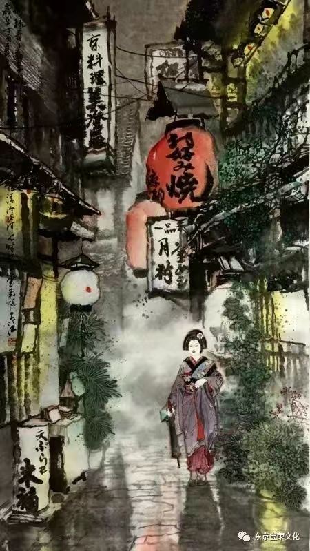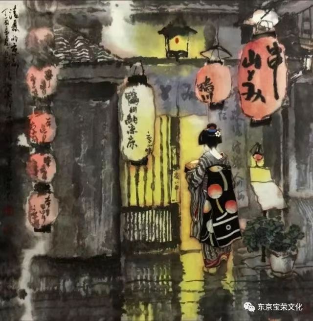 在京都就发现我们中国古代的文化在京都留下来很多,精彩的作品很多,非常非常棒的,感觉到很亲切。京都的这种生活,也给我了很多很多的启发。特别是晚上,在京都的大街小巷里面像酒店呀,料亭啊,居酒屋啊,像这样的一般的老百姓的生活环境里边有一种浓郁的跨越时代超越时代的,江户时代的风味,一种氛围。取材过程中只感觉穿越到那个时代一样啊,眼前穿梭匆匆的走过的这些人里面都是像那个时代的人一样。瞬间瞬间的,有时一种恍惚的感觉。 日本有很多画家呢,更多表达的是古代寺庙,而我是抓住了他们城市风景,包括人们的一种生活景象。