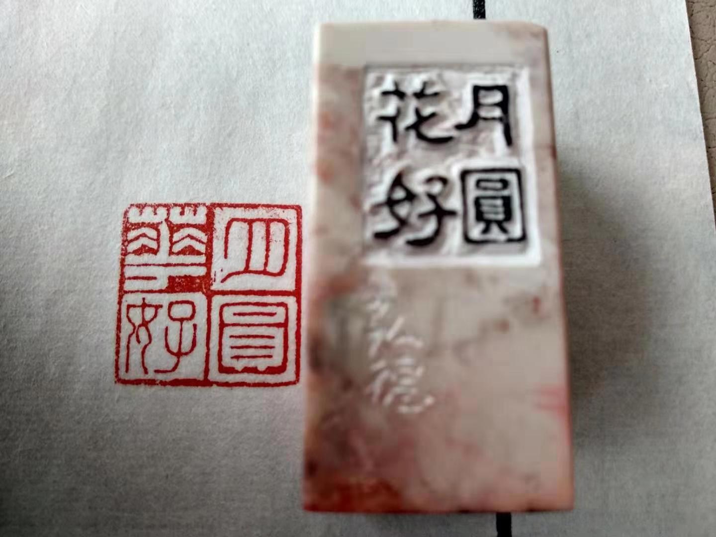 今天我的篆刻作品<月圆花好>。