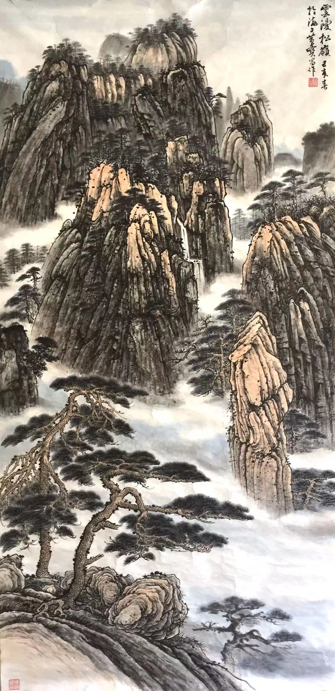 黄宝昌    纸本浅绛"雲漫松嶺"138x68cm。