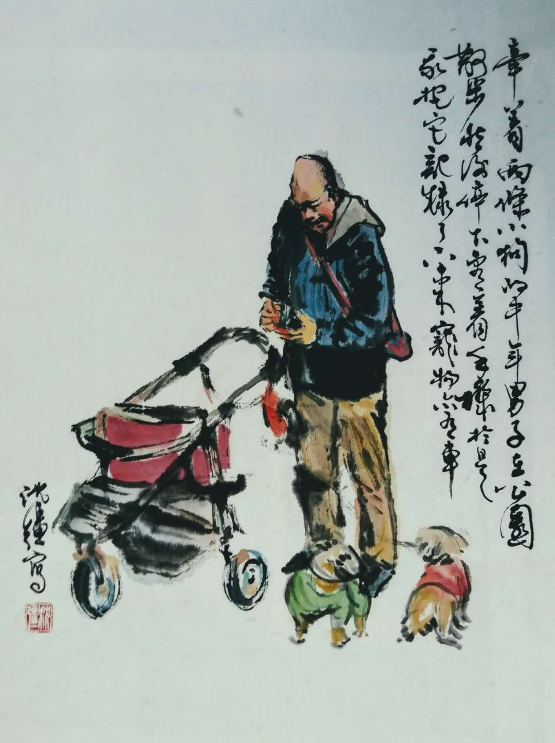 彩墨速写"寵物也坐童车"