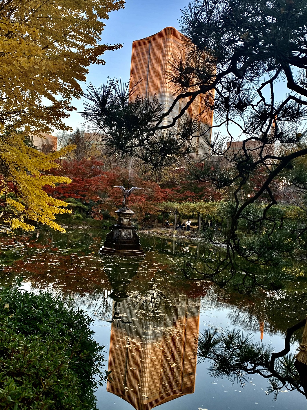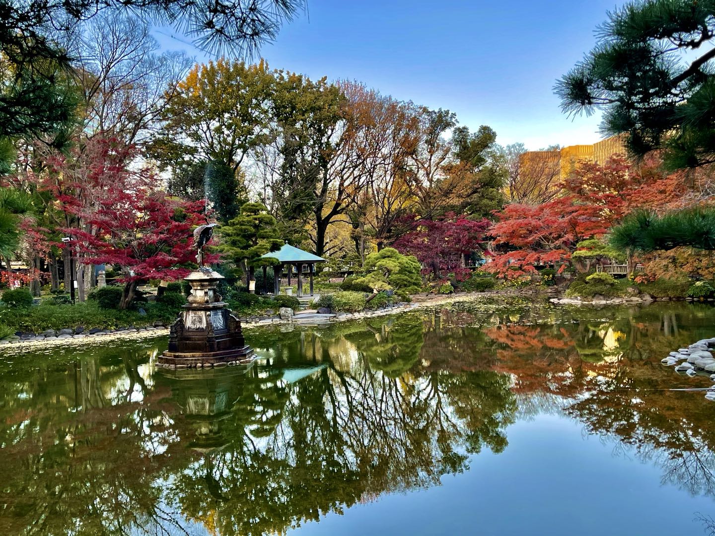 浓妆尽兴艳蓝天。                                  游东京近郊千叶县“养老溪谷”,白云缭绕,瀑水流潺,蓝天倒映,红叶逐波,其声如乐,娓娓动听,其景似画,美不胜收。