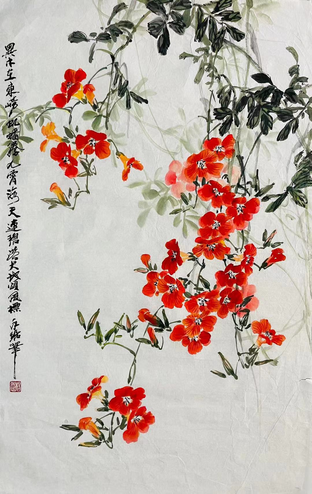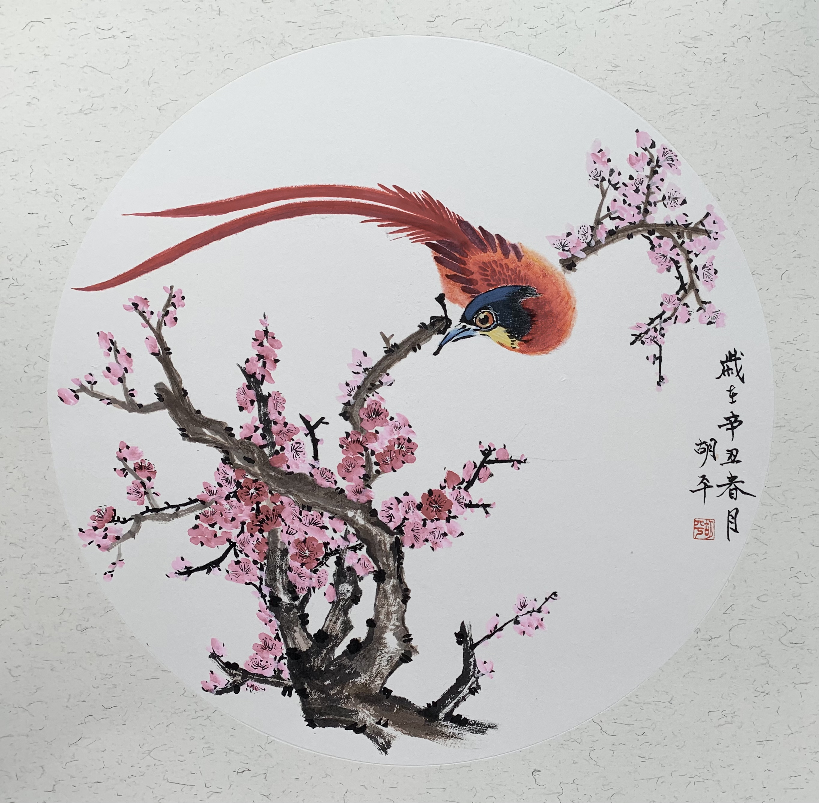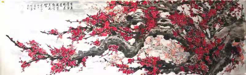 长羽飘逸似彩旗,红梅盛开赞繁荣