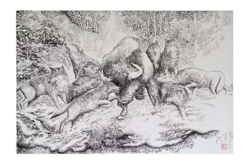 朴永哲 钢笔画《群狼捕猎》