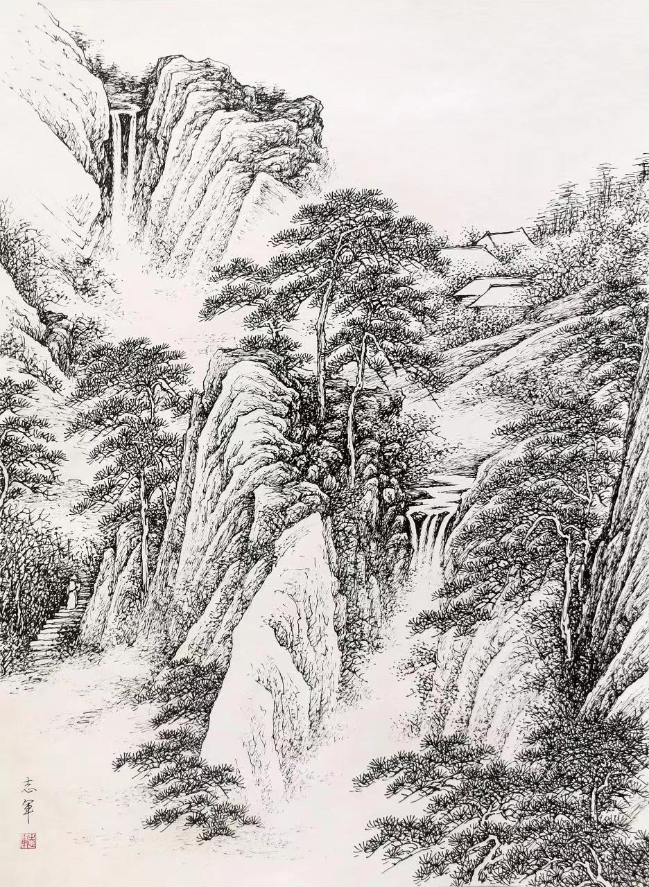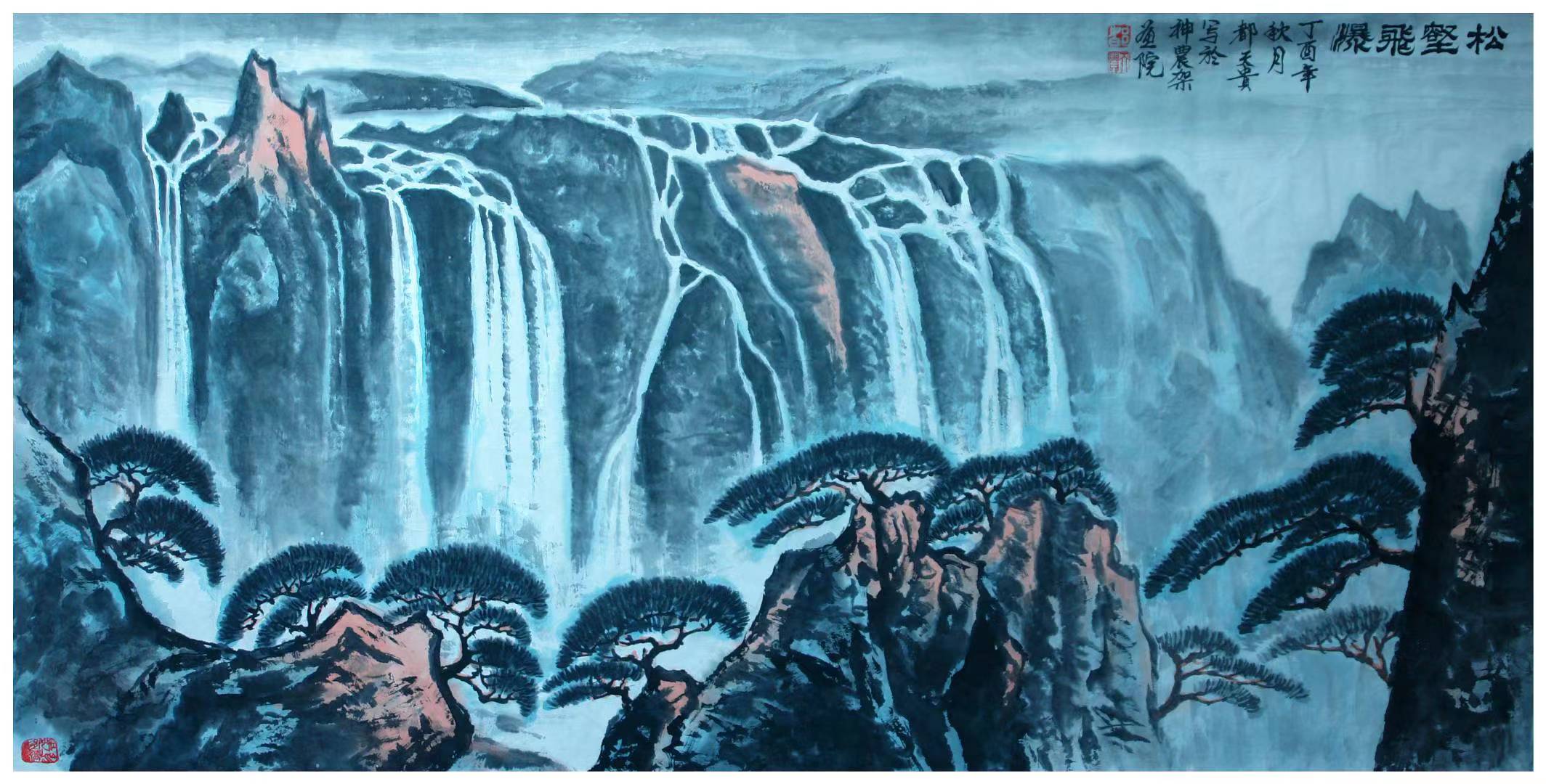 松壑飞瀑(138厘米X69厘米)  都天贵水墨      现代笔墨,气势恢宏。