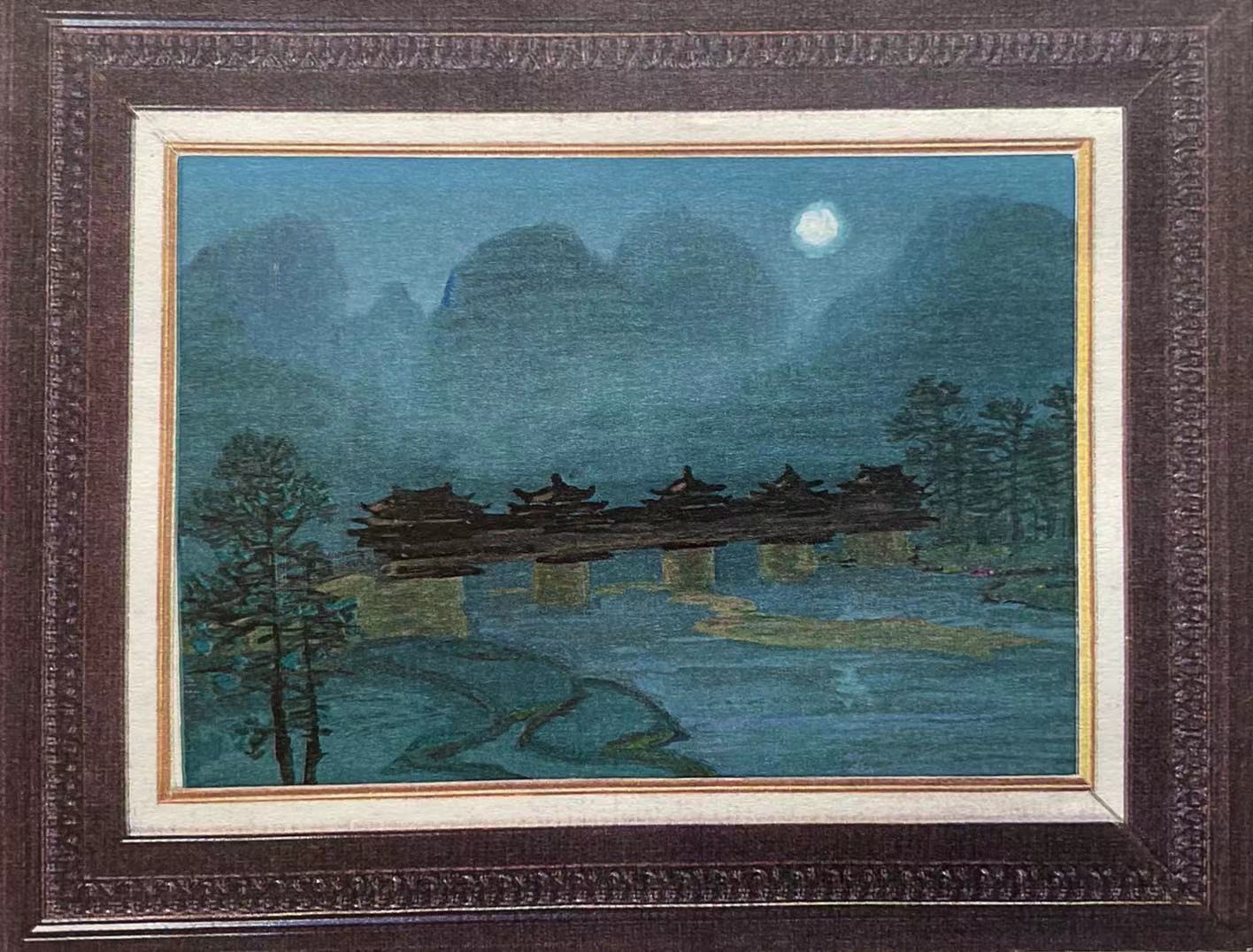 一张夜色朦胧,水雾朦胧,月照花林皆似霰,河水静静地在流淌。另一张如雪的月光覆在屋顶上,夜色静谧而美好…。