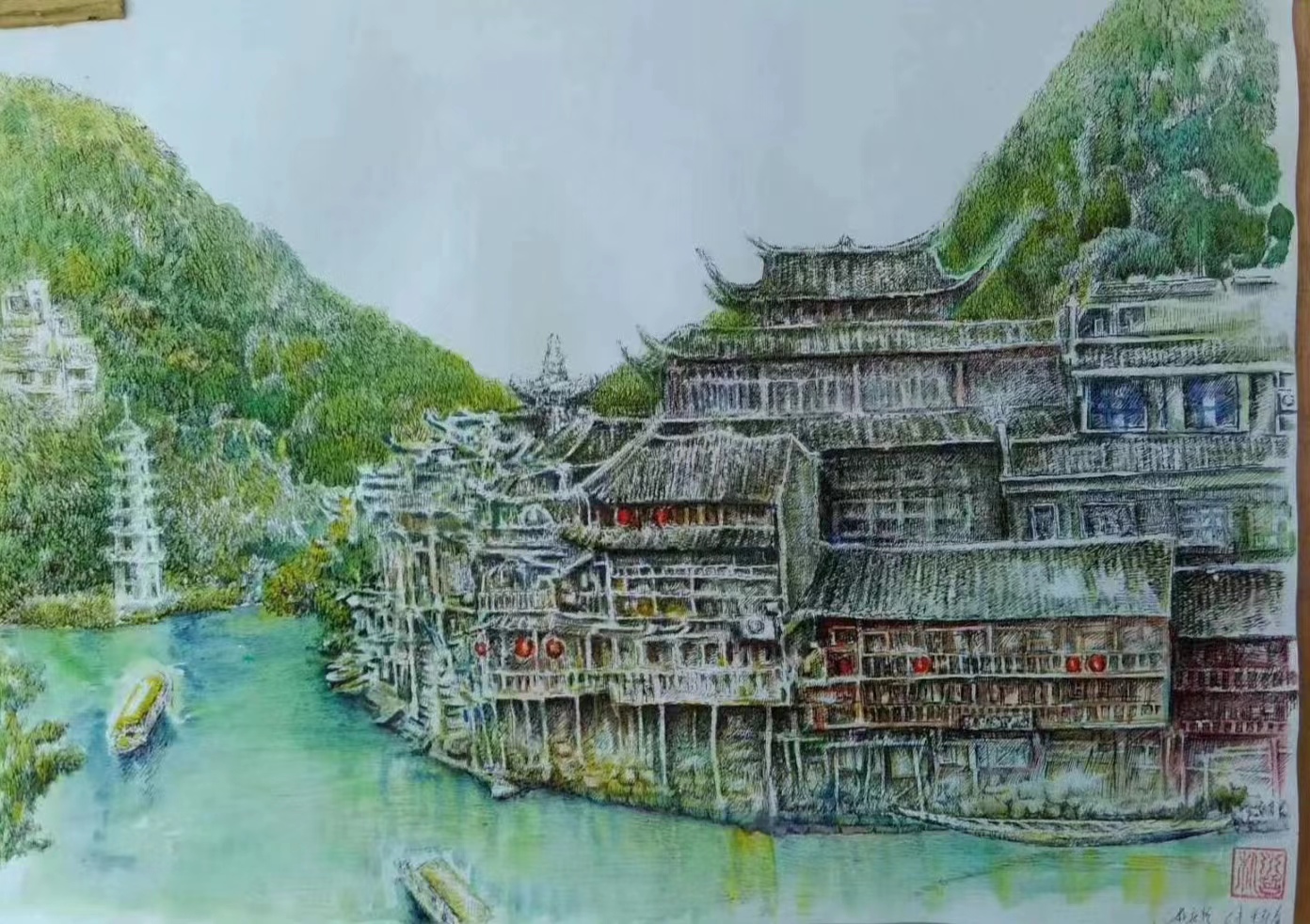 朴永哲钢笔画作品名题:《湘江凤凰古城沱江之十二》