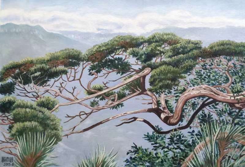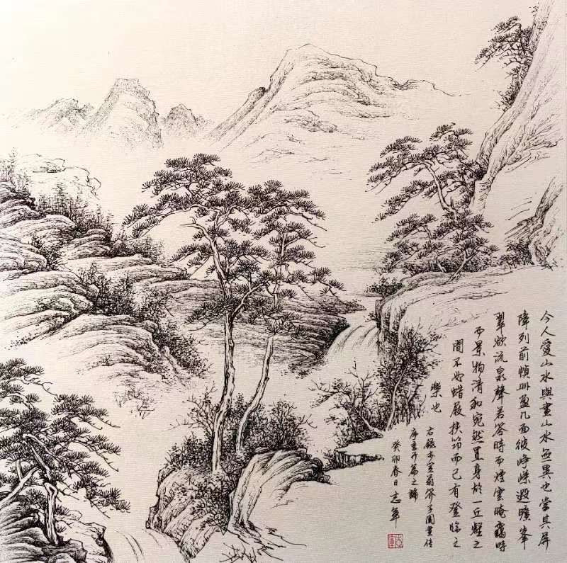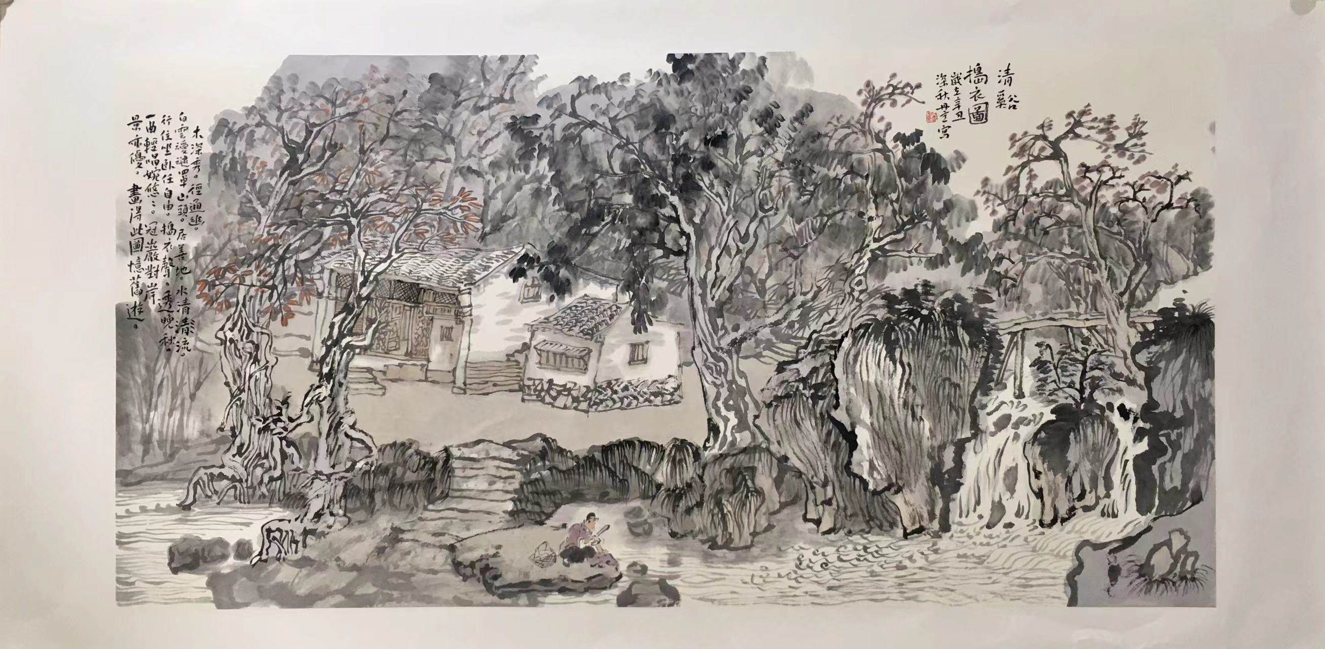 木深秀,径通幽,白云叆谴罩山头。居善地,水清流,行住坐卧任自由。捣衣声,透晚秋,一曲轻唱婉悠悠。冠岩对岸景亦优,画得此图忆旧游!
