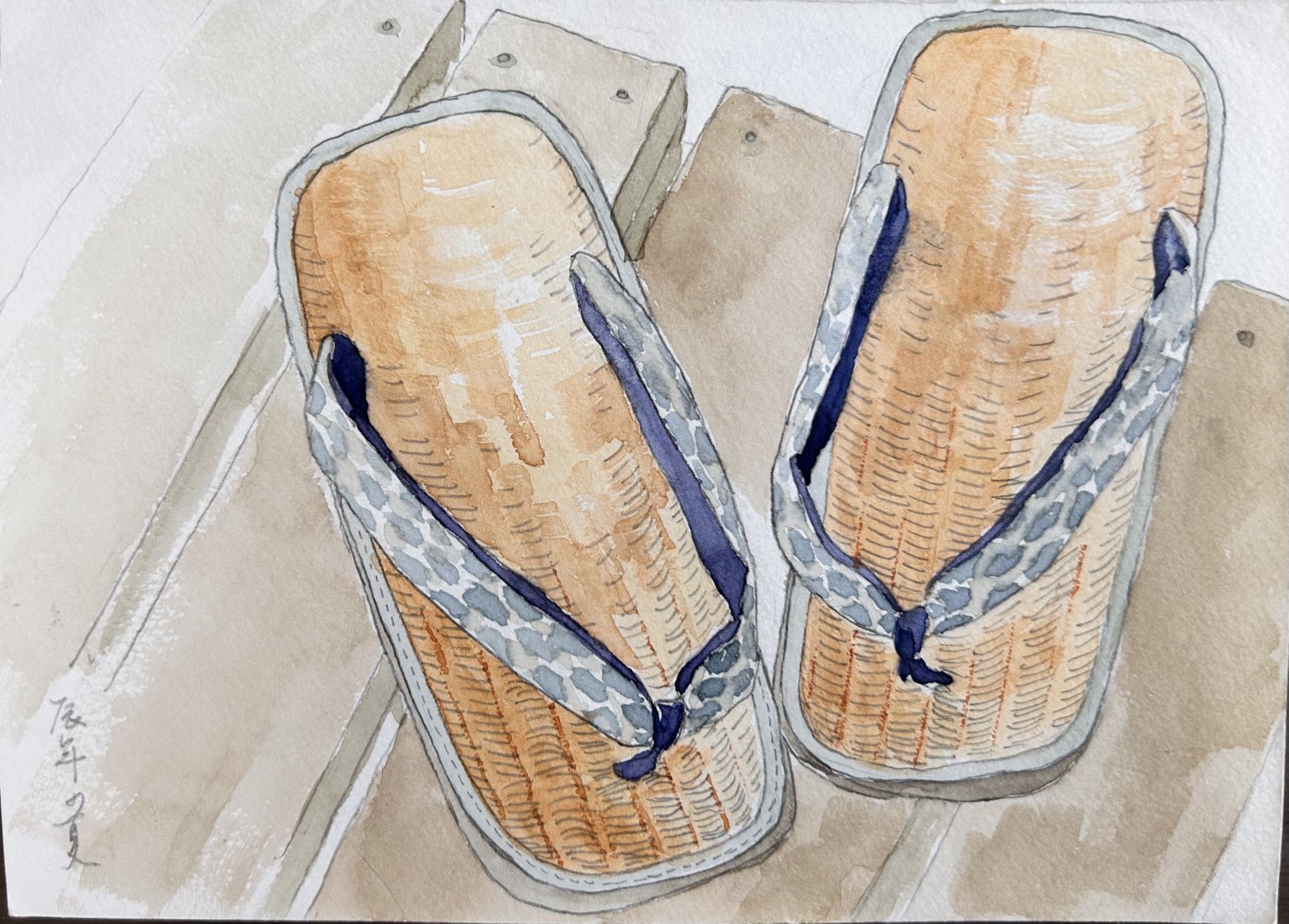 那个女人已经不算年轻,看上去快四十岁了,穿着一袭高雅的紫色真丝皱面和服;桌子旁还坐着一个穿露肩的粉红色衣服的女孩,该是她的女儿吧。女孩套着短袜的像两条白色木棒然而却并不那么纤细的小腿无聊地晃荡着。