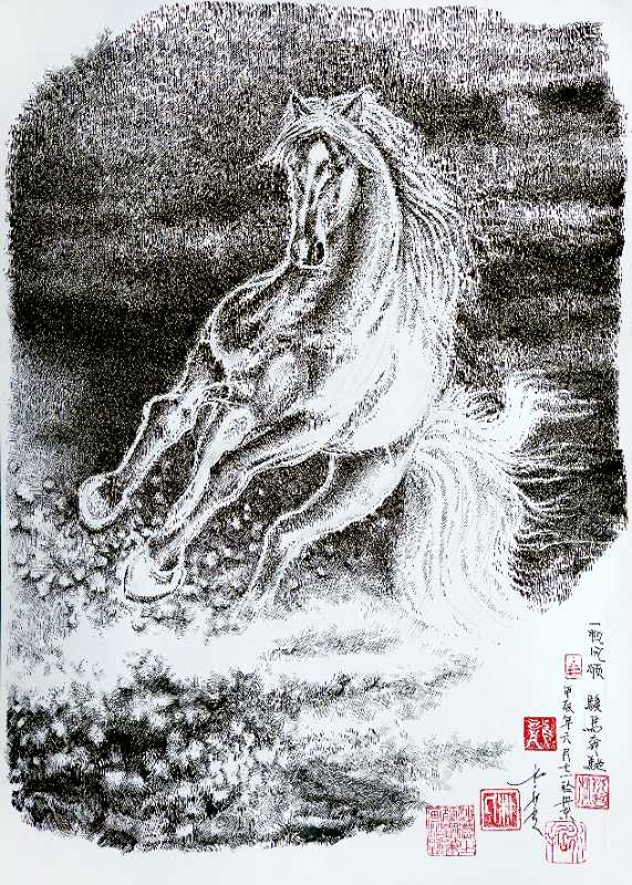 朴永哲钢笔画《一帆风顺,骏马奔驰》