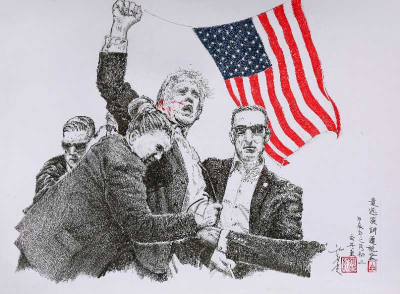 朴永哲钢笔画《竞选演讲遭枪袭》尺寸:54cmx39cm
