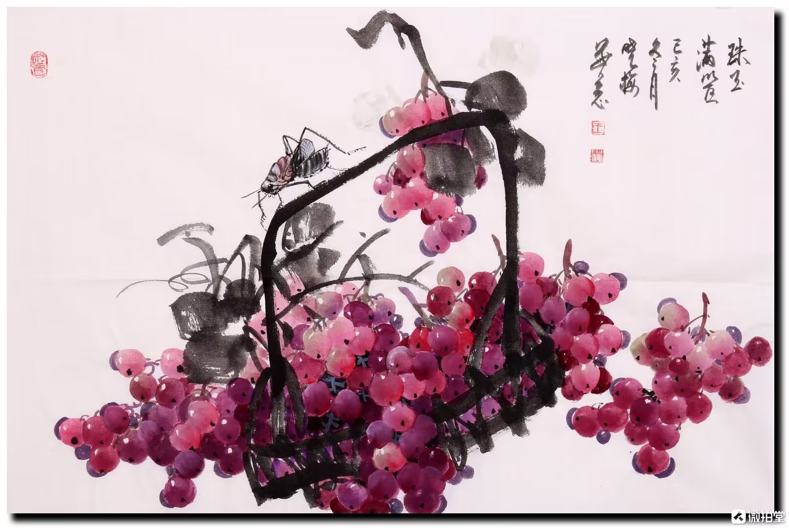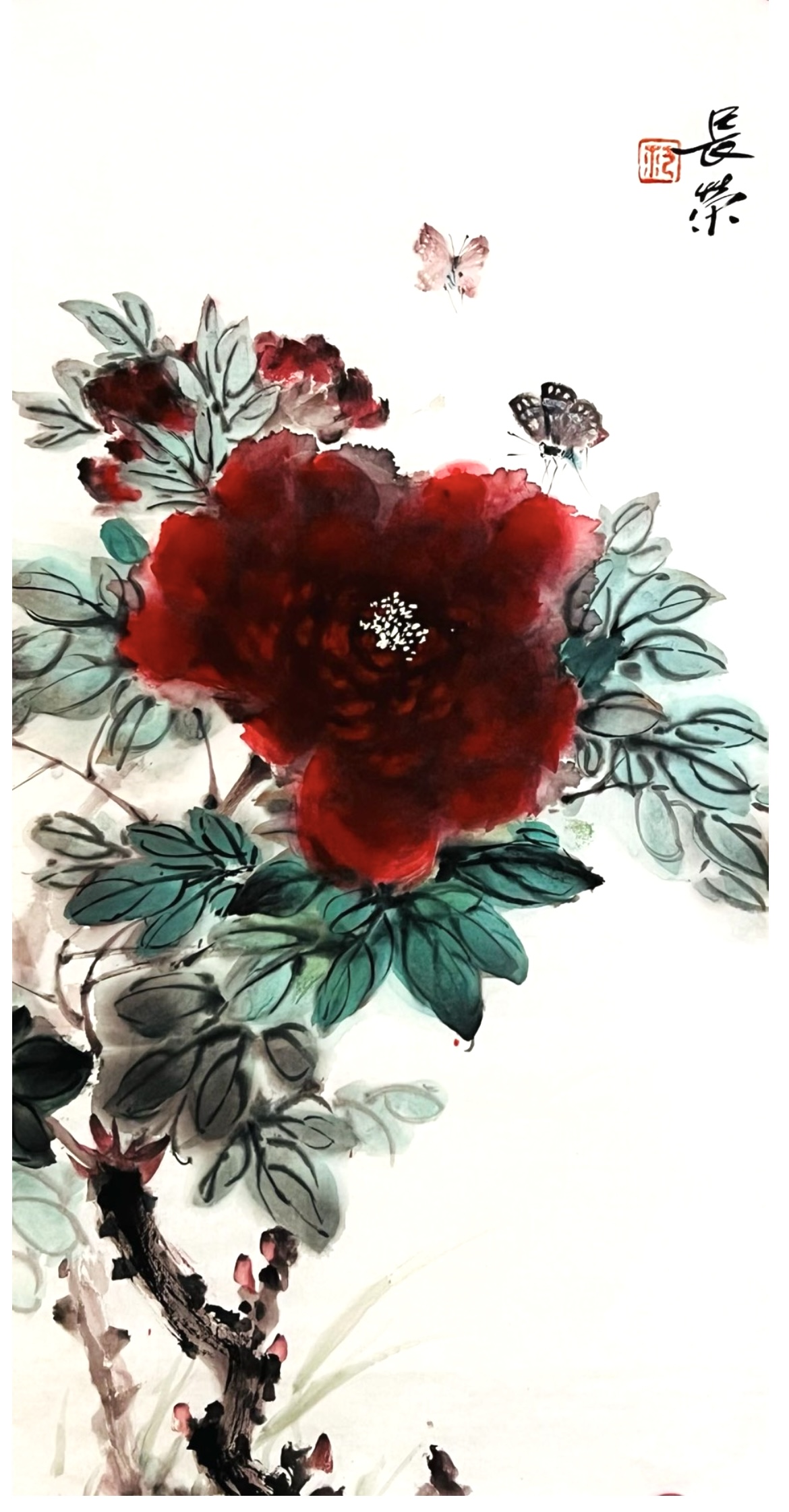 画风偏愛牡丹紅,筆底留香滴露濃,