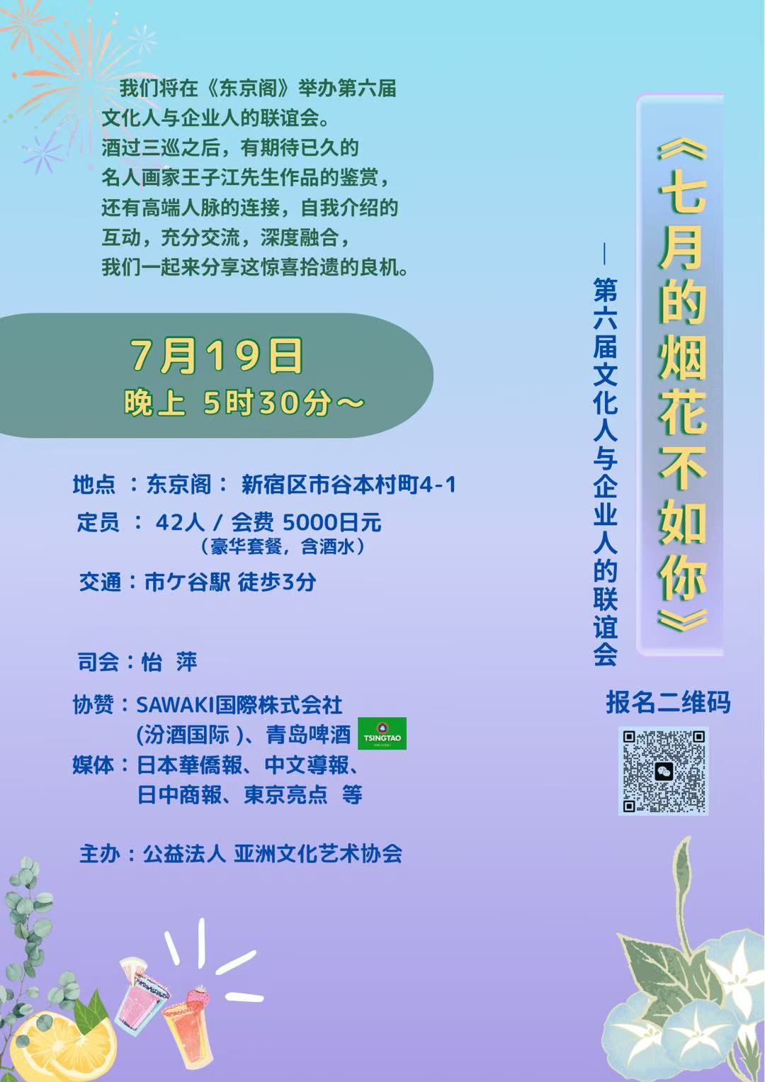他的名字叫王子江,王老师真是多才多艺的人呀,据说作品还都是听着音乐完成的,有点与众不同。联谊会的当晚也可以欣赏到他的部分作品,我怀着好奇心准时到达会场,会场位于新宿区市谷车站的《东京阁》中华料理店。