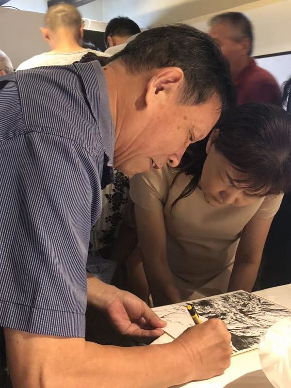 钢笔画家陆建新先生热心地为朋友签名留念。