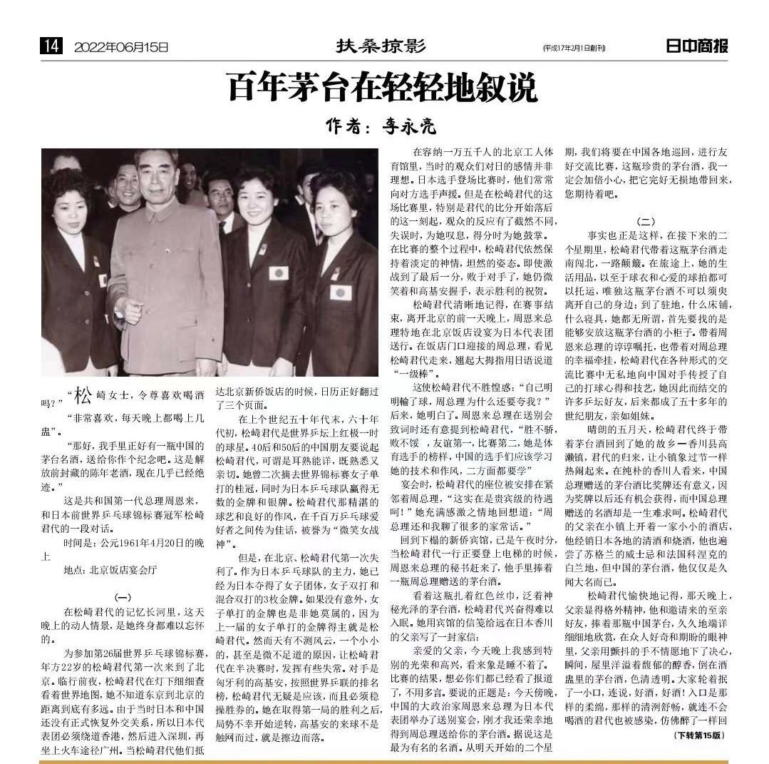 想起前不久参加NPO法人亚洲艺术文化协会主办的【百年茅台轻轻地叙说】线上朗读欣赏会---记日本乒乓国手松崎君代和周恩来总理的友情的真实故事,在线上见到了前日本世界乒乓球冠军松崎君代女士,很是感动,至今难忘。
