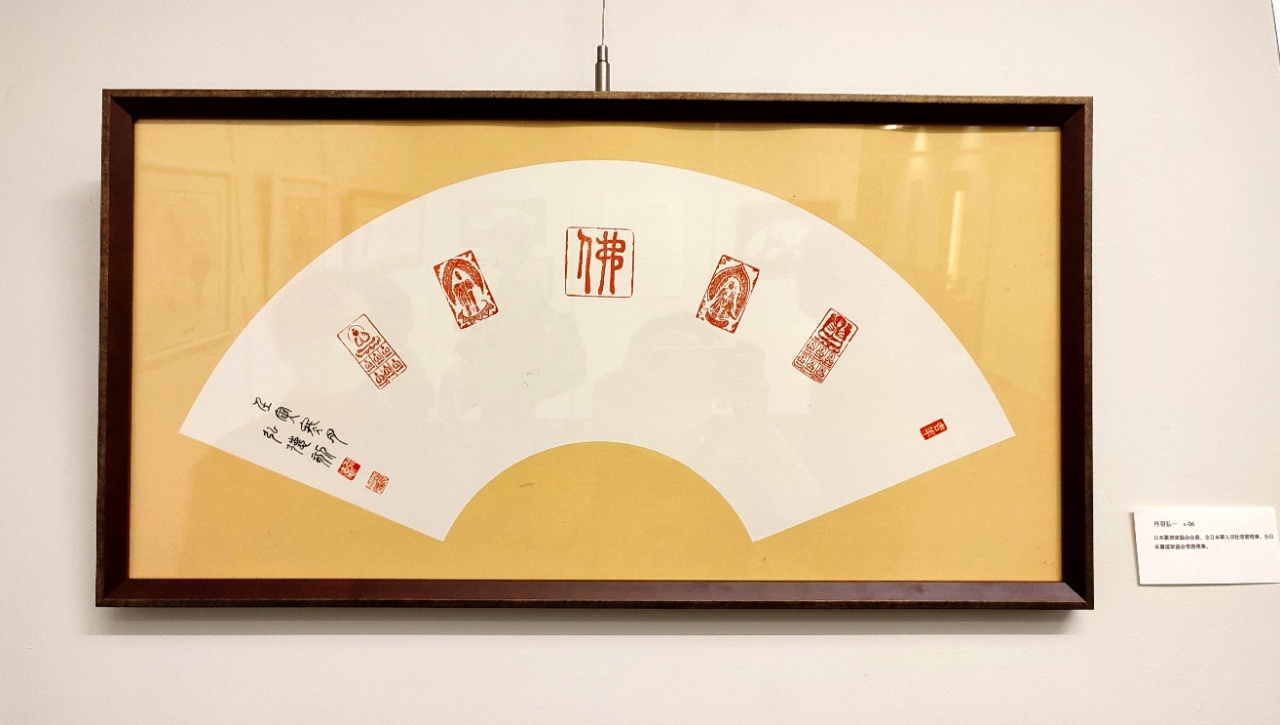 下面的这副扇面是日本篆刻家学会的丹羽弘一老师的作品,境意为佛充满禅意,金石华彩,方寸之间,佛像篆刻之精细,刀走凌云志,字形流云姿,篆刻扇面特色佳作。