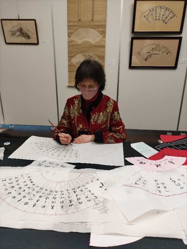 21日大年三十除夕,这一天是由在慶應大学任教的多才的吴敏老师为来宾作精彩的扇面书法表演,她那细腻入微,如行云流水般的笔势,让在场的来宾赞不绝口。在书写的间隙,吴敏老师还满怀激情地为大家演唱了京剧名曲片段,把展会的气氛带入了一片柔和温暖融入之中,在场的中国朋友们也情不自禁的一起清唱起了京剧片段。可谓是书法与戏曲总有说不尽的异曲同工之妙也。还有朋友有幸的拿到了吴敏老师的墨宝。