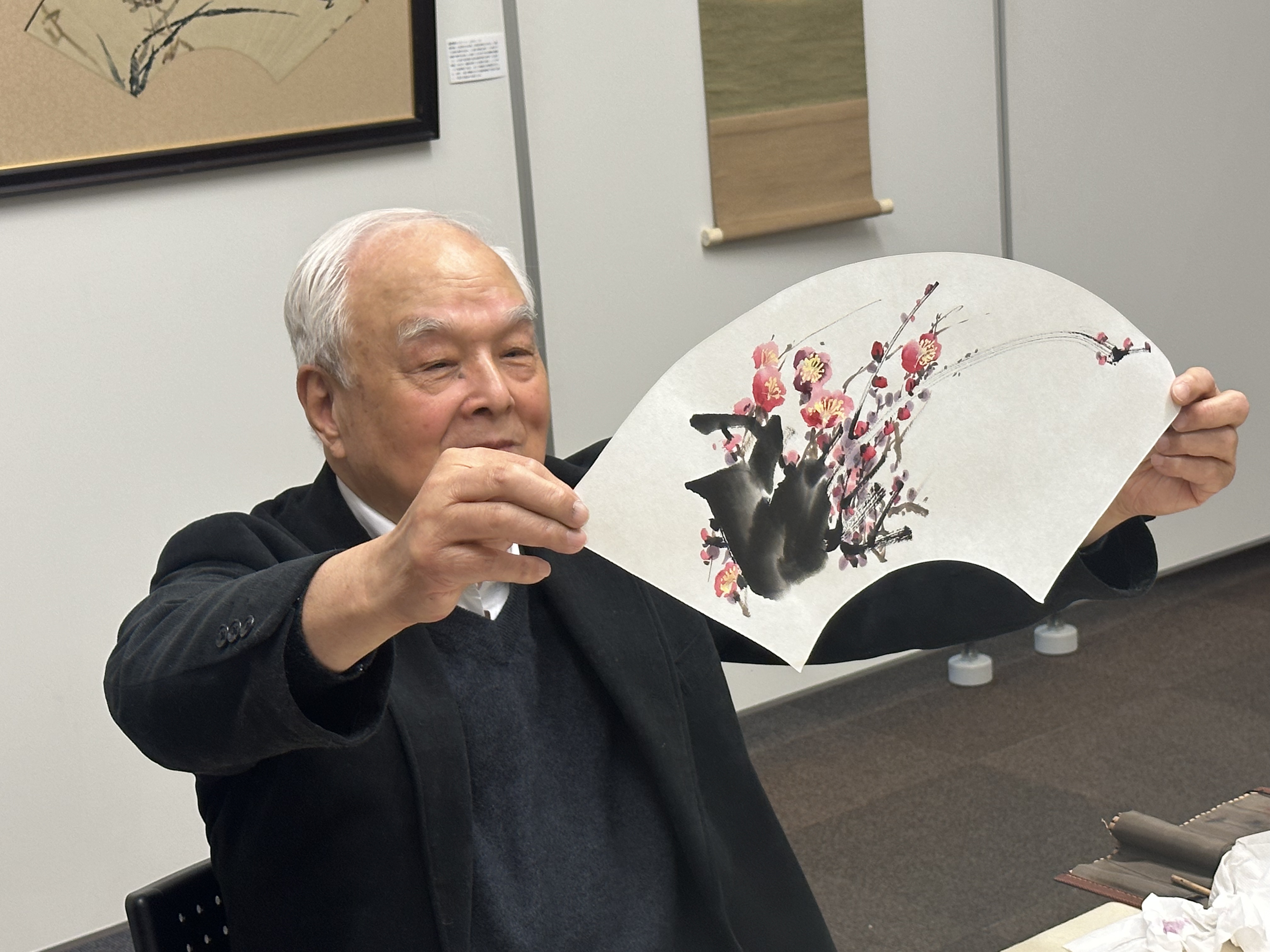 22日正月初一春节,这一天也是东京入冬以来最为寒冷的一天,但在扇面书画的世界里,却充满了温馨和暖意,著名京剧戏曲人物画家李文培老师来到了展会。从中国水墨画的选笔,浓墨中麝香的味儿和色,绘画中所需的基本钛白藤黄大红三绿到花青的12种颜色,逐步联系到黑白宇宙之间大自然中五彩缤纷的大千世界,告诉我们艺术的创作都是基于激情、情绪和情感的表现。正直大年初一,李老选择了画《傲雪红梅迎春图》以示喜迎新春的美好祝愿。