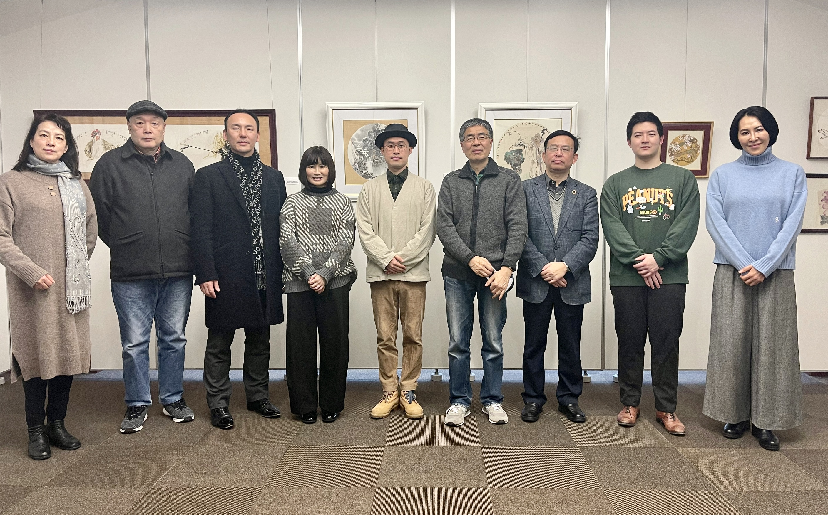24日这一天寒风刺骨,一队红色娘子军结伴而来,她们都是怡萍的好朋友们,有从横滨来的,有从茨城来的,大家更是在百忙的工作之中抽出时间,她们的到来给展会增添了温暖和欢笑,这一天是由怡萍来讲解。怡萍在接到此次工作任务并拿到资料的时间都比较晚,她也对绘画及书画理论的了解和知识非常有限,但是万事开头难,只怕有心人,她见缝插针用功的阅读着那些让人舒心又叫人头疼的文献资料。以她的风格,告诉大家,她喜欢美術館喜欢看美术作品,如何看美术作品,从哪一点开始突破,如何融入一幅作品并想象一幅作品,延伸到画外,并且从画的世界结合到现实社会的一些感受,以情动人,娓娓道来。她始终与观众保持着一种双向沟通的渠道,让来宾听得津津有味。怡萍感谢老师们的信任鼓励和助言,表示更加热爱美术,了解文史增长知识。