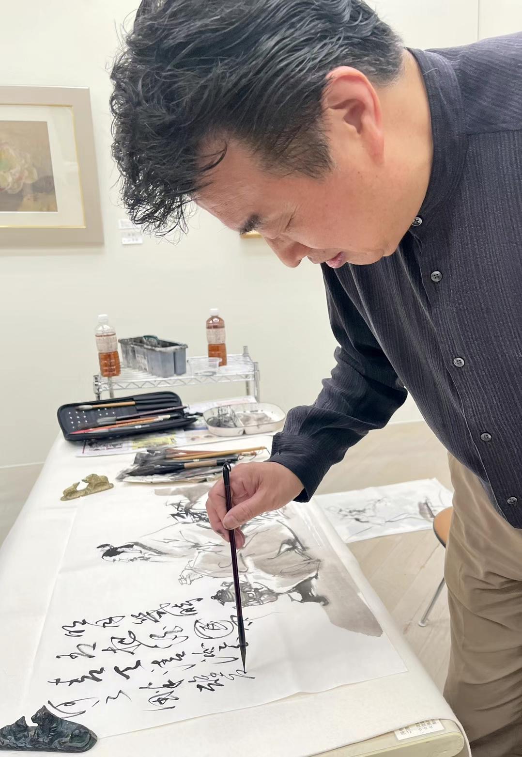 【日中画家书家美术展】的第五天,周六的东京一大早就下着雨,远处出现一个身背大包,精神抖擞,打着伞的熟悉身影,他就是在百忙之中抽出时间,为展会做现场表演的著名画家王子江老师。