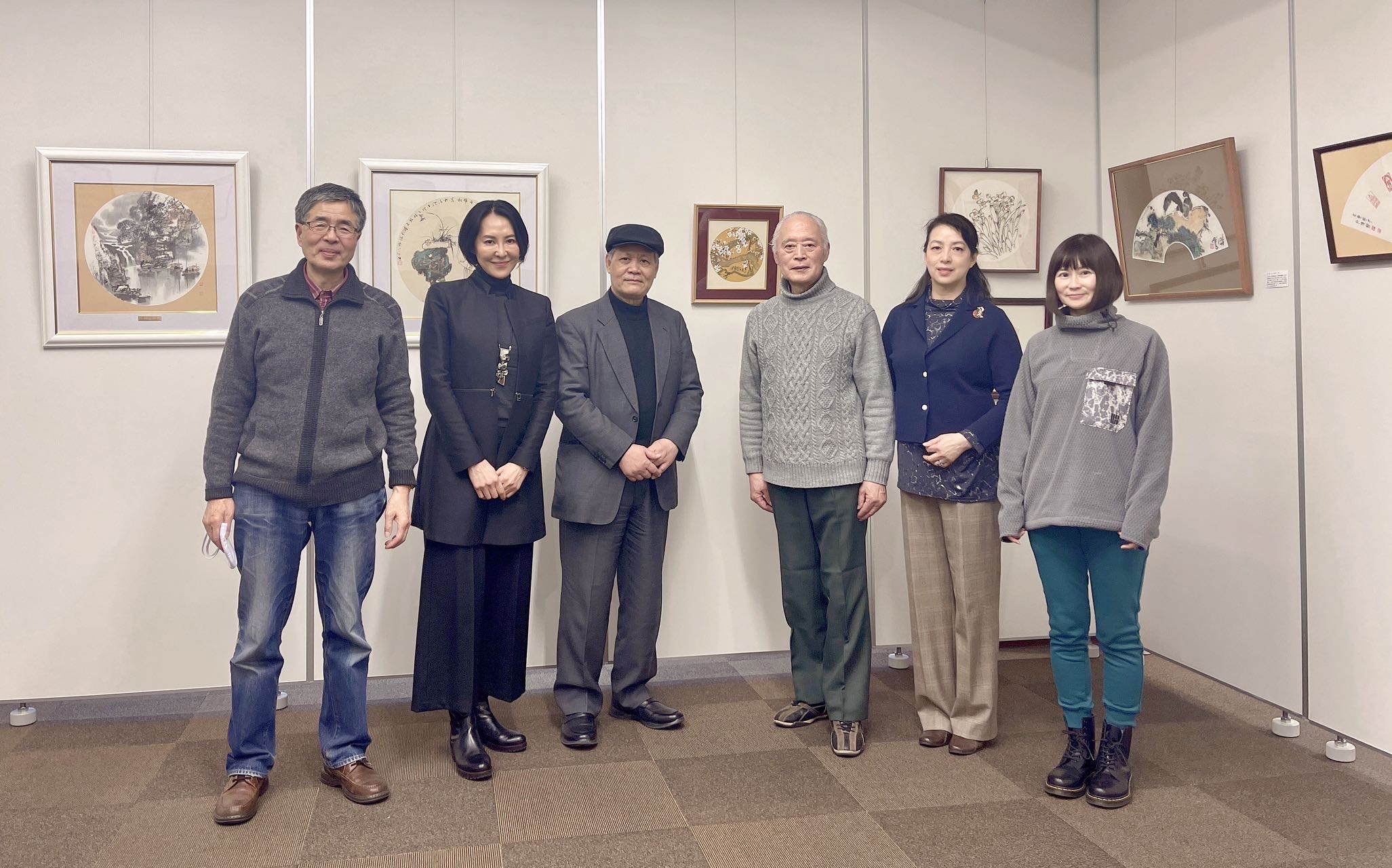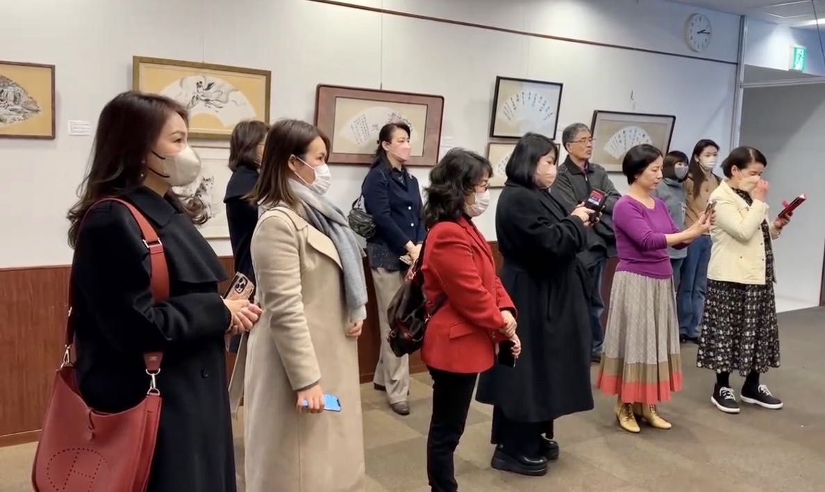 令人高兴的是,我们东宝沙龙的元老、此次展览会发起人之一的杨永居先生,今天居然冒着凌厉的寒风从群马县来到了涩谷文化中心。他与客人和工作人员倾心交谈,同时在名人名作前留下珍贵的合影,于是,会场里洋溢起一片久别重逢,心照神交的喜悦...