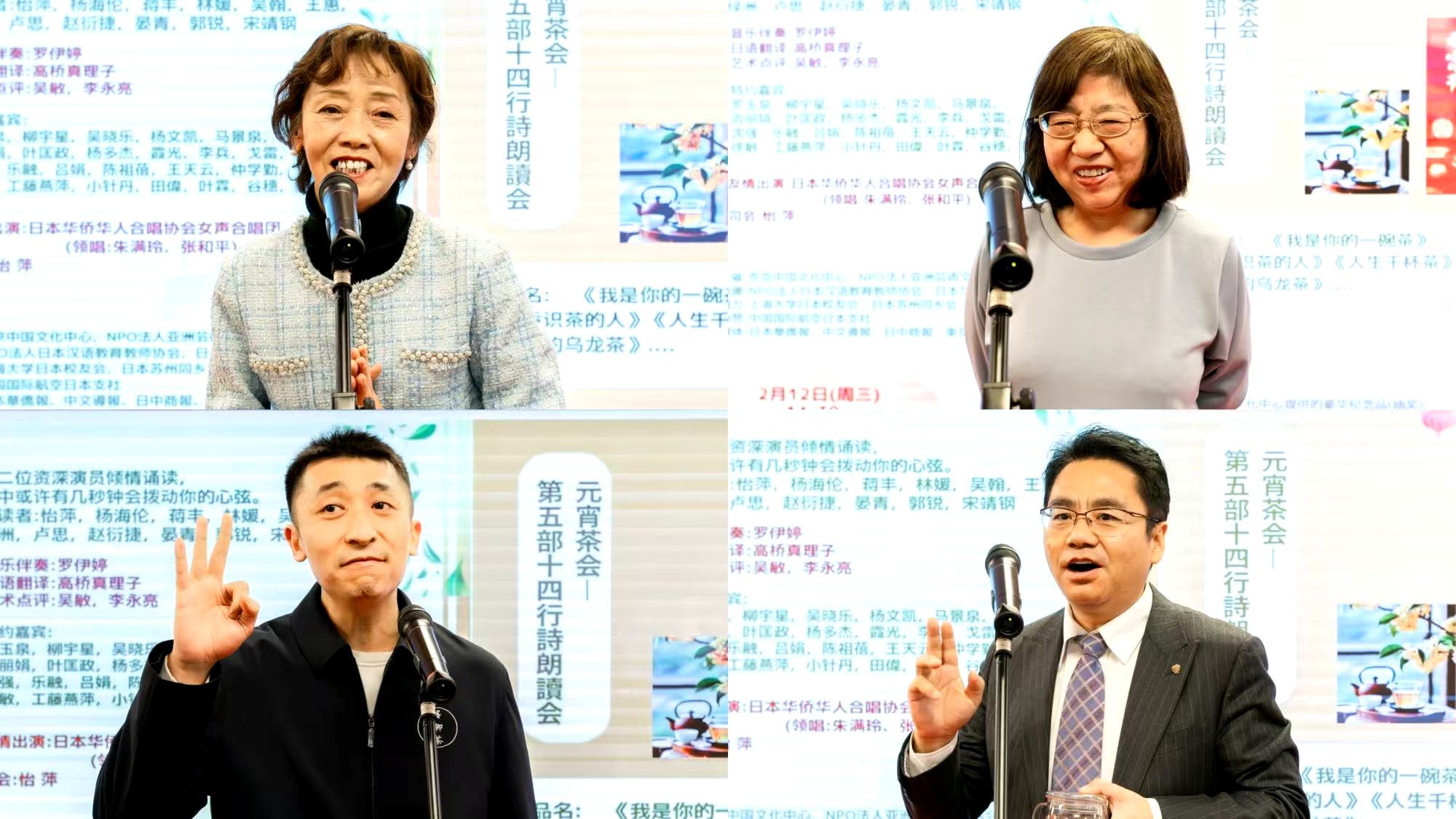 这天,注定就是一个与以往哪一年都不同的元宵节。文化中心内人头济济,热闹非凡。场内不仅座无虚席,还有许多观众只能站着参加。朗读会,由日本华侨华人合唱协会女声合唱团的一曲「茉莉花」拉开了帷幕。歌声响起,忽然就唤起了我的思乡情。虽然在节目单上看到第十首诗的题目是「碧螺春里的秘密」,知道家乡的茶会出场,完全意想不到苏州的茶竟然会两次出镜,好惊喜!