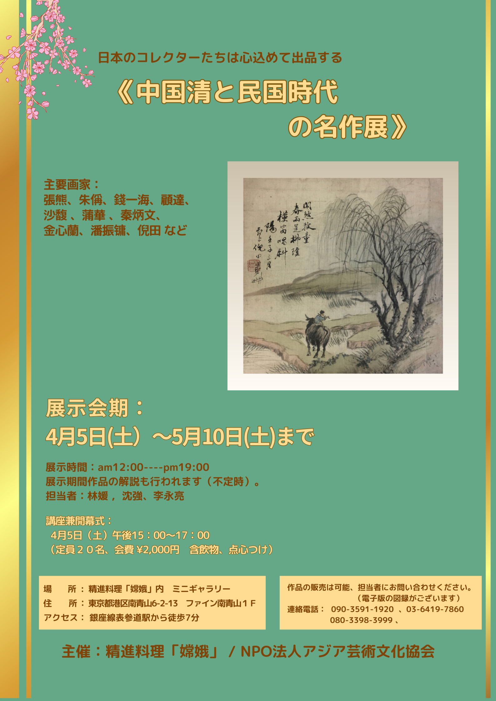 四月的表参道,樱花如雪。穿过林立的名品店与艺术画廊,踏着根津美术馆外斑驳的光影,我来到这座东京最具文艺气息的街道。今日之约,是藏身于《嫦娥》精進料理店中的《中国清末民初名作展》。一场由公益法人亚洲文化艺术协会(理事长李永亮)与精進料理店《嫦娥》(店主吉田みゆき)联袂呈现的文化雅集,正悄然演绎着素食美学与传统艺术的绝妙共鸣。