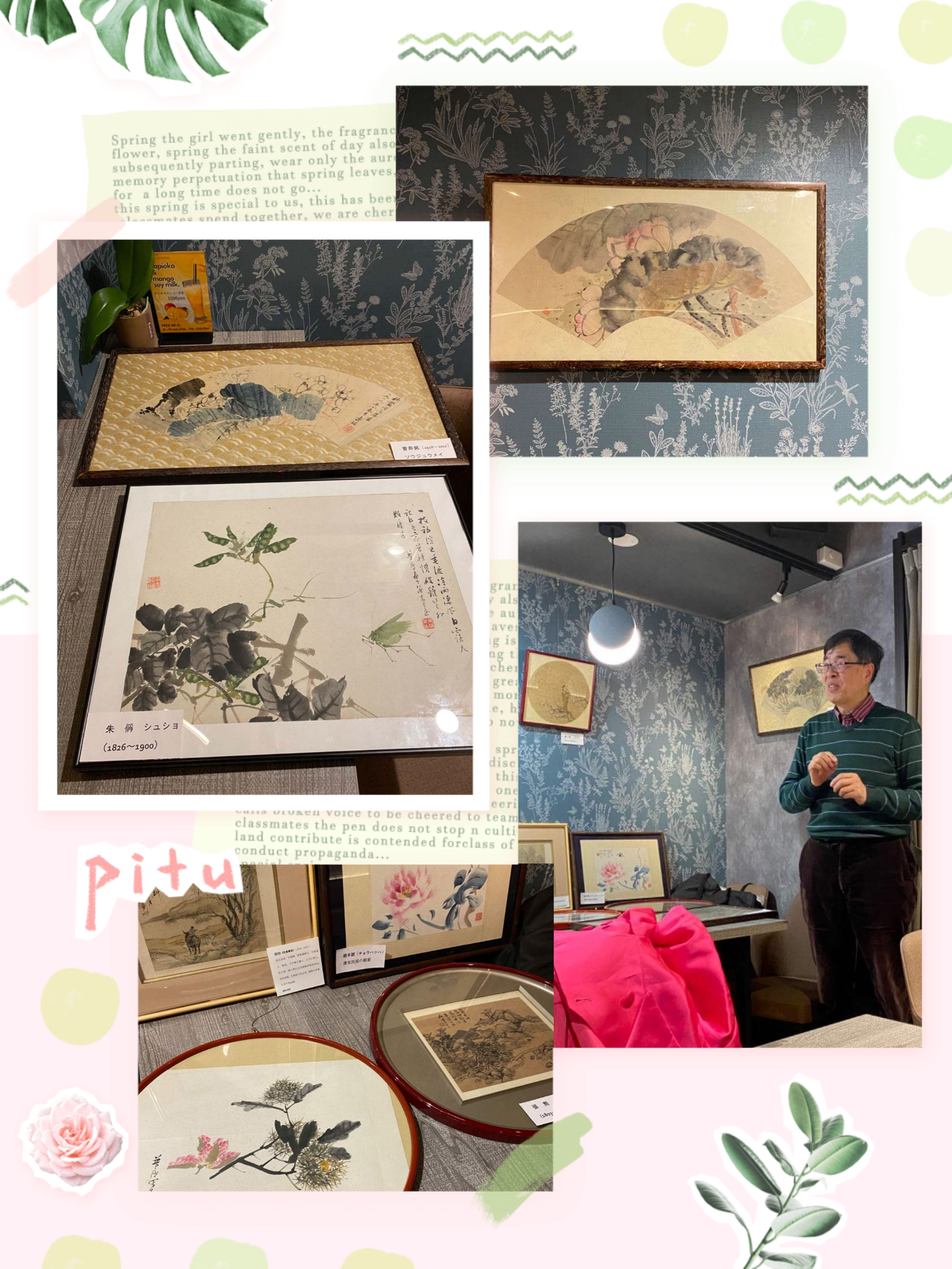 这次活动由日本藏家们提供的十几幅清.民书画作品,包括如钱一海(近代)、张熊(1803~1886)、朱 稱(1826~1900)、顧達(清代画家,字椒园)、趙半跛、倪田(1855~1919)、曹寿铭(1918~2012)等等的画作。内容包括风景、山水、花鸟、昆虫等作品。形式上除了正统的四方形画框,还有圆形、扇面等的不同装帧的古画。