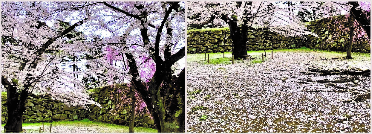 虽然受气候影响,鹤之城的樱花已经飘落不少,望着那地上的花瓣随风飘起时,不禁伸出双手想去追赶。而护城河面上的花瓣们,则好似一群唧唧喳喳的姑娘们,风起,她们会时而往东时而往西地笑成一团,好不热闹。