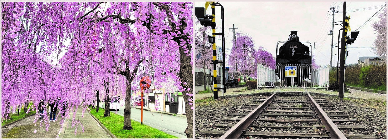 走着走着,被一个黑漆漆的大家伙挡了道。原来这是曾经在日中线上开过的蒸汽火车,车头与垂樱相映,仿佛岁月突然返回了好几十年。