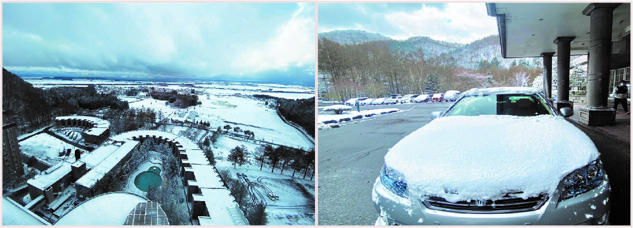 就在为没能看到此地的樱花而惋惜时,大自然送来了一个惊喜!清晨起床,觉得周围静得出奇,拉开窗帘,发现窗外是白茫茫的一片。原来下了一夜的雪,将外面的世界变得银装素裹,与前一天的景色截然不同。此酒店的特色,是每个房间都是湖景房,能看到那著名的猪苗代湖。住一晚能看到两个季节的美景,太值了。四月的雪,还真是令人兴奋。看到酒店的铲雪车一早就将通向大道的积雪铲得干干净净,相比之下我们车上的雪却还是厚厚的。仅仅除去了前窗影响视力的那些雪,我们大笑着,怀着童心,载着春天的雪,就此向终点站出发了。