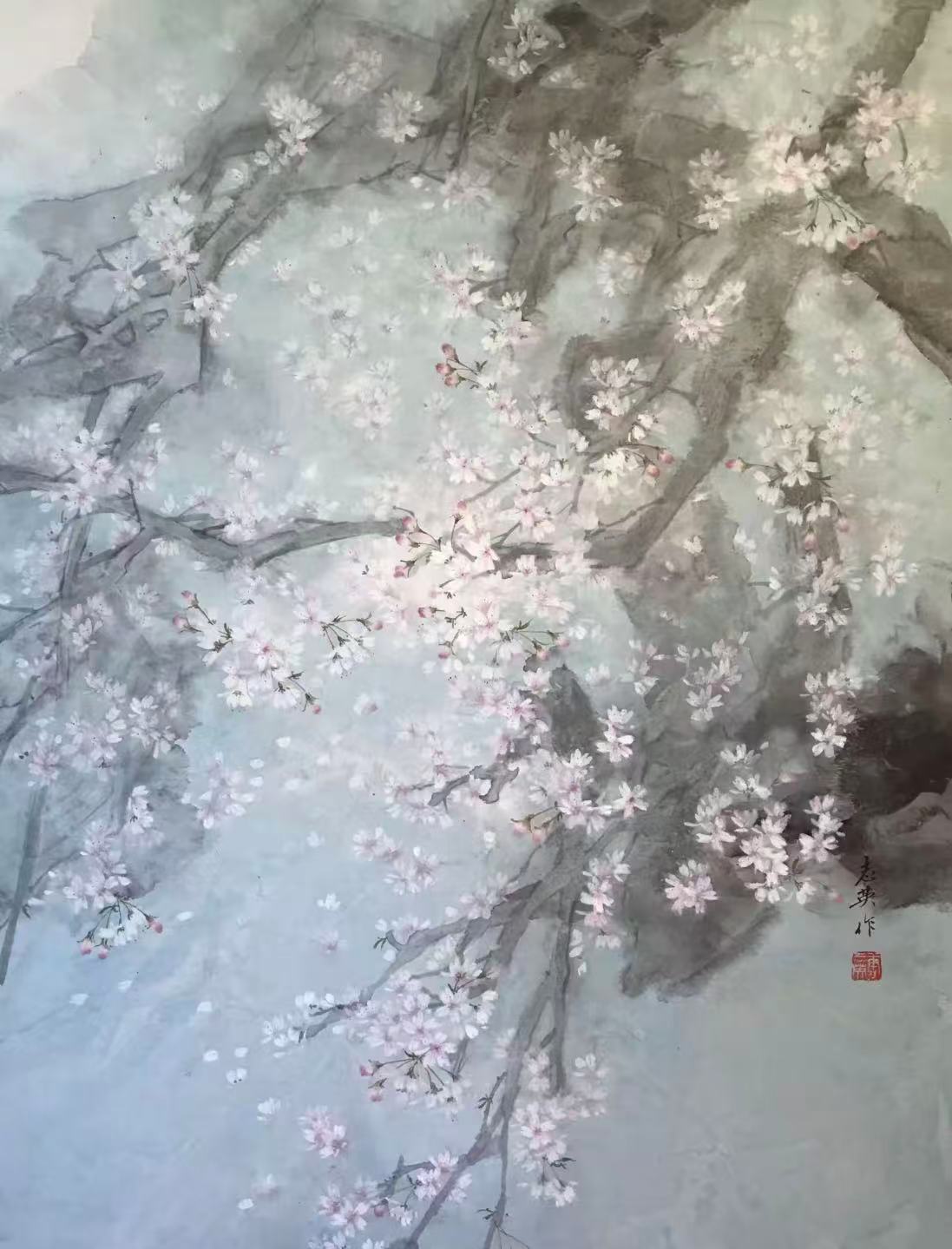 我也分析学习日本画中一些樱花名作,学习优秀画中的意境与色彩的融合。我深感从花苞到画一朵朵粉红色樱花渐变是一个美的历程,而画一棵樱花树更需把握氛围气场,从樱花花瓣飘逸里找出空间、距离感,试图来画出各种美的差异。坦率地说不厌倦画樱花是因为自己巳把人生和樱花重叠了,随着年复一年看到的东西又变了,有生之年想既平静又有趣地面对樱花,随着时间的推移来不断找寻樱花创作的新表现。