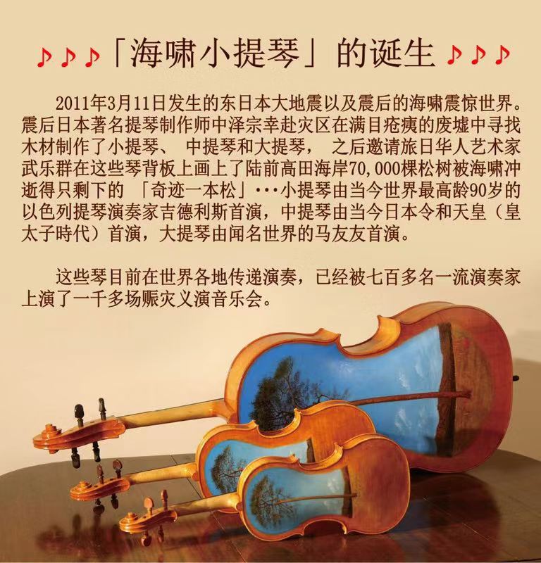 2011年3月11日发生的东日本大地震让全世界为之震惊,特别是震后随之而来的海啸造成的人员和财产的伤害更是骇人听闻、举世愕然。大地震后日本著名提琴制作师中泽宗幸先生赶赴灾区,在当地有关部门和人员的协助下不分昼夜在被海啸冲倒的房屋、树木以及废墟中寻找到了一些可用的木材,经过半年多的精心制作完成了一把具有特殊意义的小提琴。随后中泽先生找到了旅居东京的华人画家、音乐家武乐群先生,请求他在这把小提琴的背板上描绘出重灾区岩手县陆前高田海岸的“奇迹一棵松”。