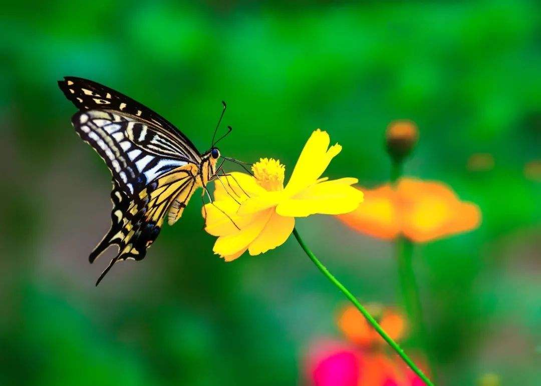 绿水波中嬉白鹭,红花丛中舞黄莺。