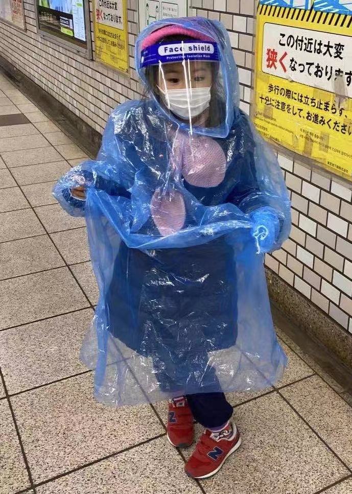 感觉疫情极大地杀伤了我的生活热情,我不敢外出,每天宅在家中。时而又担心小外孙女每天坐电车回家会怎么办?苦思冥想中,想出了让女儿给外孙女买百元店的(一次性)雨披,好在女儿也接受我的建议,每天穿一件不同颜色的雨披,回家后又丢弃,小外孙女却觉得很好玩。于是我拍下了她第一天衣服外面多出一层薄膜雨衣的小开心照片,请朋友们看一下小外孙女用的防疫雨披。