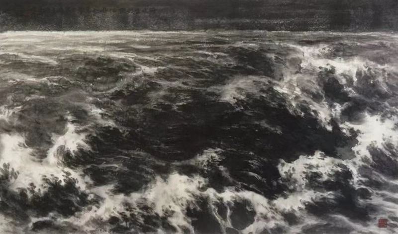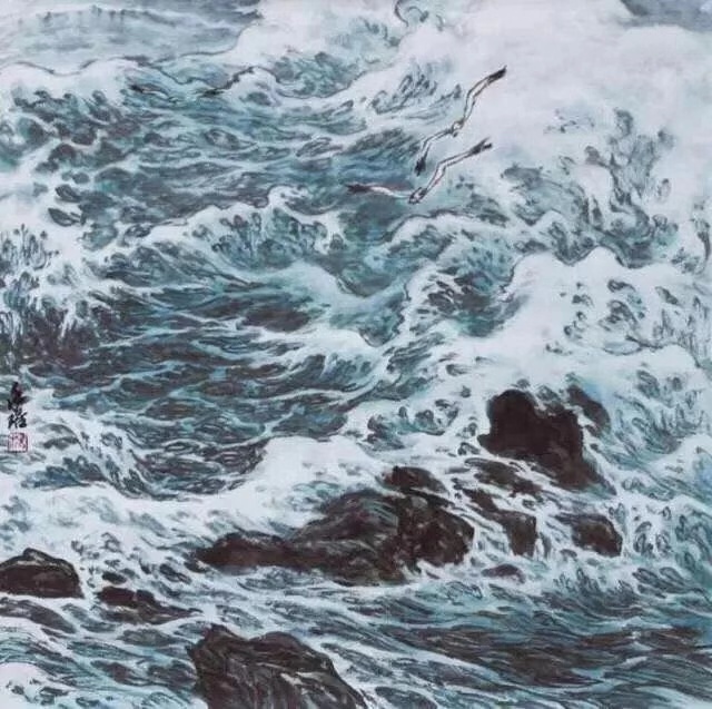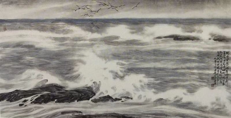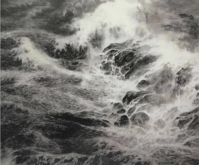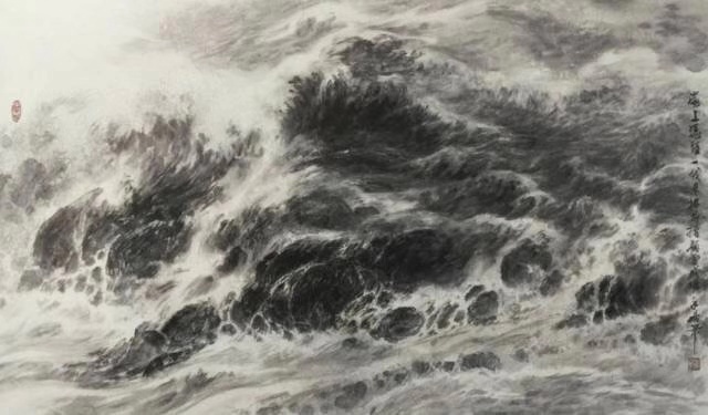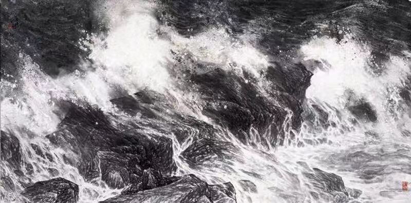 杨永琚的创作思路从博采众长,到找到专攻的方向。他将视点聚焦在水波、浪涛的表现上,创作出《海潮》、《推波逐浪》、《海阔浪高》等作品。古人云:“近水之度,曲尽其态”,他通过水流的曲折缓急,海涛的汹涌澎湃,湖面的水纹碧波,将浪漫主义色彩融入其中。在那些巨浪撞击礁石的瞬间飞溅的水花中,观者能体会到一种激昂的生命力。