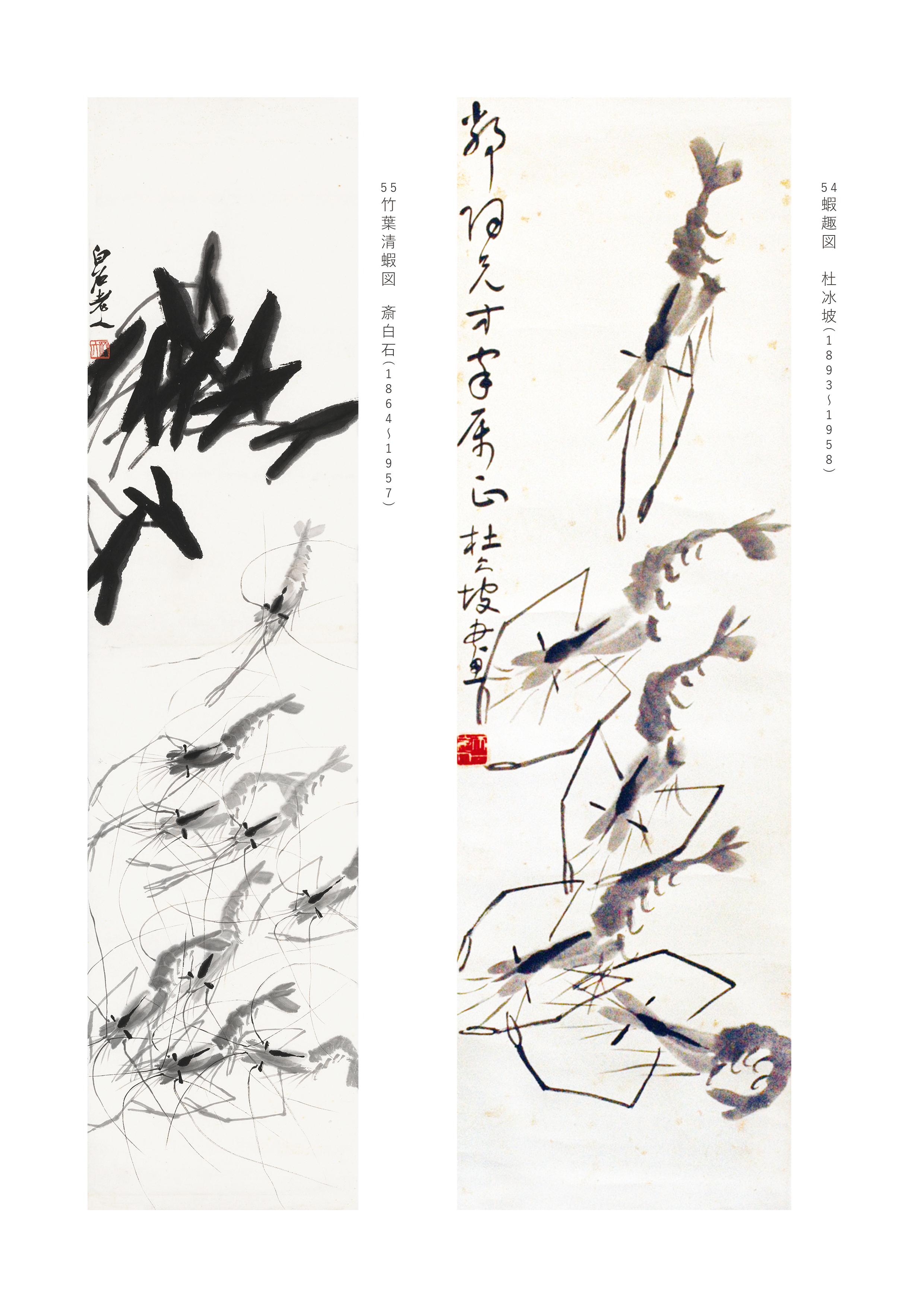 蝦趣図 杜冰坡 (1893~1958) トヒョウバ 安徽省萧县の出身,北京大学史学学部を卒業,図書館で当時毛沢東氏と同僚した経験があった。その後政府の仕事をしつつ、1952年北京書画研究会を設立する際、常务理事を担任。斎白石との往来があったことから、斎氏の作品を多く受領した。