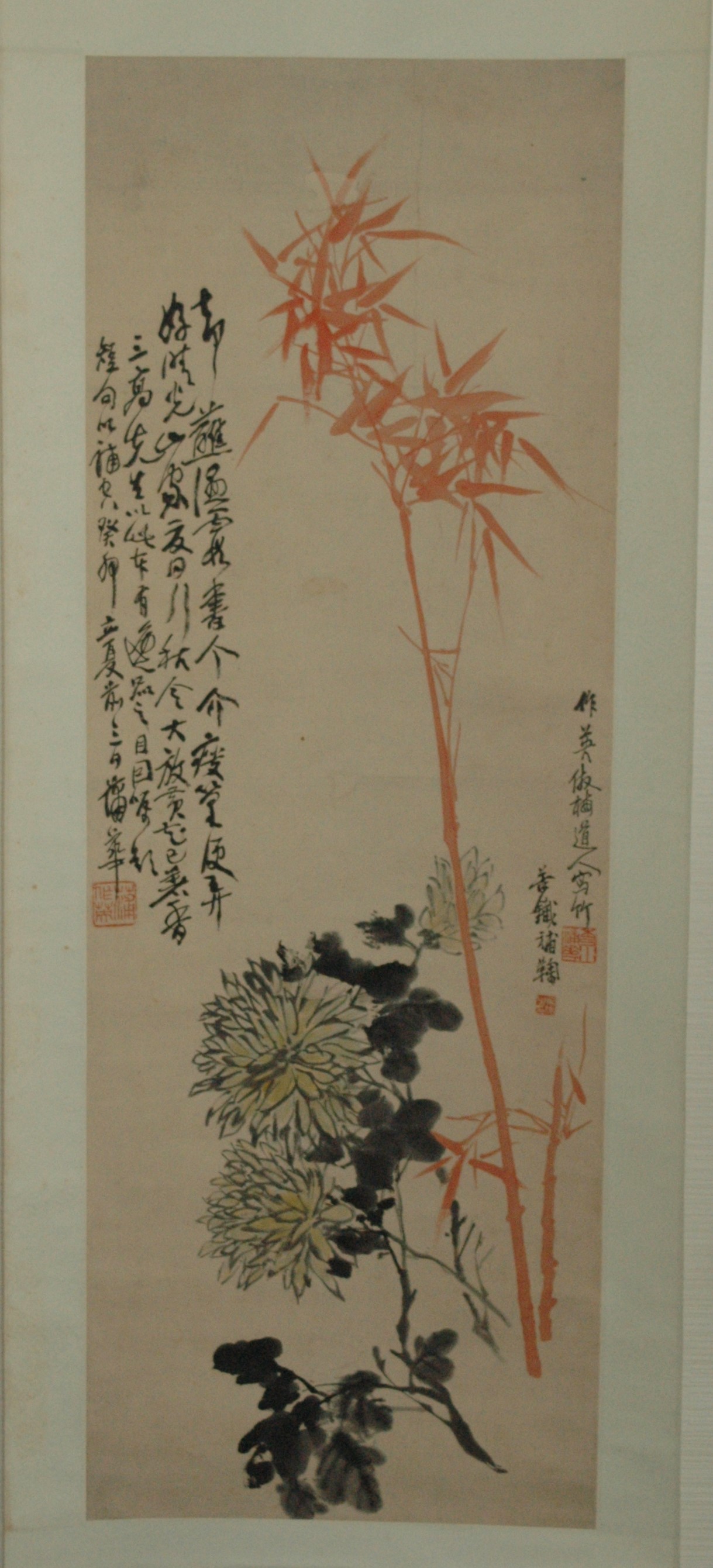 紅竹菊石図 呉 昌碩 (1844~1927) ゴショウセキ 中国の清朝末期から近代にかけて活躍した画家、書家、篆刻家。清代最後の文人といわれ、詩・書・画・篆刻ともに精通し、「四絶」と称賛され、中国近代でもっとも優れた芸術家と評価が高い。