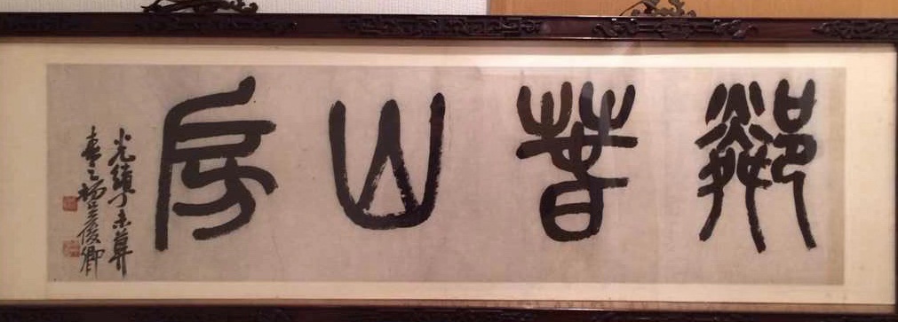 走进晋鸥的寓所,只见客厅正中悬挂着吴昌硕的石鼓文“邻春山房”匾额,左侧的墙上挂着吴让之的篆书“闲居”匾额,通往书室的门墙上,挂的是尹秉绶隶书“梅柳草堂”。房间虽然不大,但却透着古色古香,令人遐想。晋鸥说,生活在这样的环境里,每天都好像在和古人对话,美的感受渐渐地融化在心里,对自己的书画篆刻学习也有很大的帮助和促进作用。当有朋友自远方来的时候,晋鸥总是满心喜悦,毫无保留地把自己的藏品拿出来,让大家一起分享这名人书画所隐含的文化底蕴。