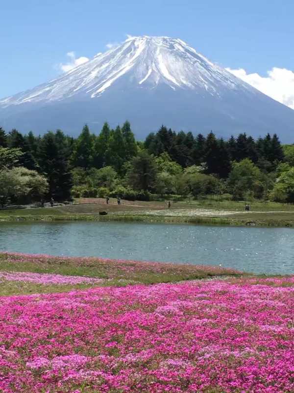 富士山,日本人的精神象征。它的魅力在于它的变化。天气好时,它清晰威严,天气不好时,它如水墨般藏在云雾之间。我抵达的时候,正是5月21号,虽然三月的樱花已落,也未到十月红叶多姿,却没有错过芝樱的开放。走进公园,最先带给人惊喜的,是大片的紫、白、红、粉红、淡粉、雪青六色有层次地铺开的芝樱,花朵密集而鲜艳,以粉红色居多,形成了一片片颜色变化有致的花海,再远眺过去,则是平静透澈的湖水,之后是成荫的绿树,而富士山只远远地露了个头儿。再转进公园里,走着走着,透过大片开放的粉色的细细的芝樱花,再望过湖水和绿树的尽头,忽然,富士山棕色的山体和雪白的山顶仿佛画面推出般,完整地呈现在眼前!那一时刻的欣悦与肃穆之情无法用语言去形容,心中只不断重复闪现着一个念头:如果能一生都站在这儿欣赏富士山该有多好!