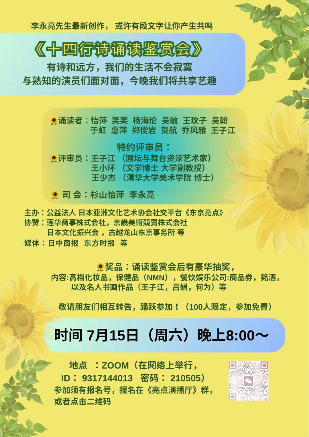 七月东京,在东京宝荣李永亮先生的组织下,日本华人文艺界的朋友在云端开展了一场风雅别致的十四行诗诗会。有幸邀约参加了本场诗会,既欣赏了名家字画,又被各位朗诵行家的声音所折服。